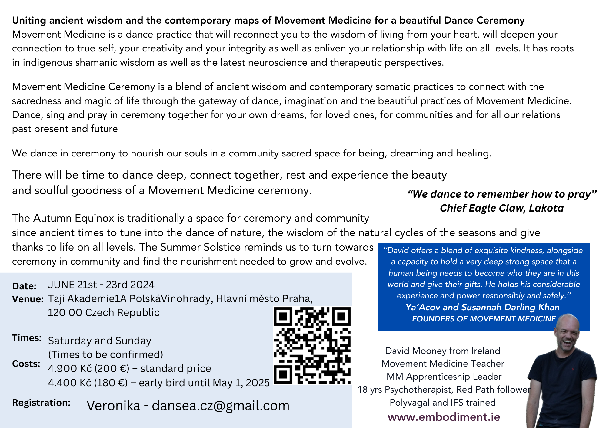 David is a fully qualified and practicing psychotherapist. He has trained in Polyvagal Theory with Deb Dana and completed Level 1 and 2 training in Internal Family Systems training he integrates these skills and his passion for shamanic pathways into his work as a qualified Movement Medicine Teacher in Ireland throughout Europe and in America and Canada. He follows the Lakota Redpath.